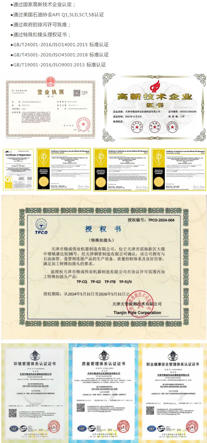 公司遵循API质量方针“科技为本,质量第一;顾客满意,持续改进“。通过了GB/T24001-2016/ISO14001:2015 标准,GB/T45001- 2020/ISO45001:2018 标准,GB/T19001-2016/ISO9001:2015 标准和美国石油协会 APIQ1,5LD,5CT,5B认证,产品质量受到市场的广泛认可。