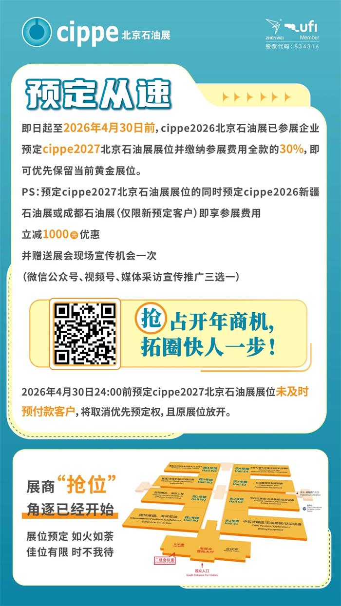 石油石化行业的伙伴们注意啦!cippe2027 北京石油展展位预定“老友福利”全面启动,现在正是锁定黄金展位的最佳时机!